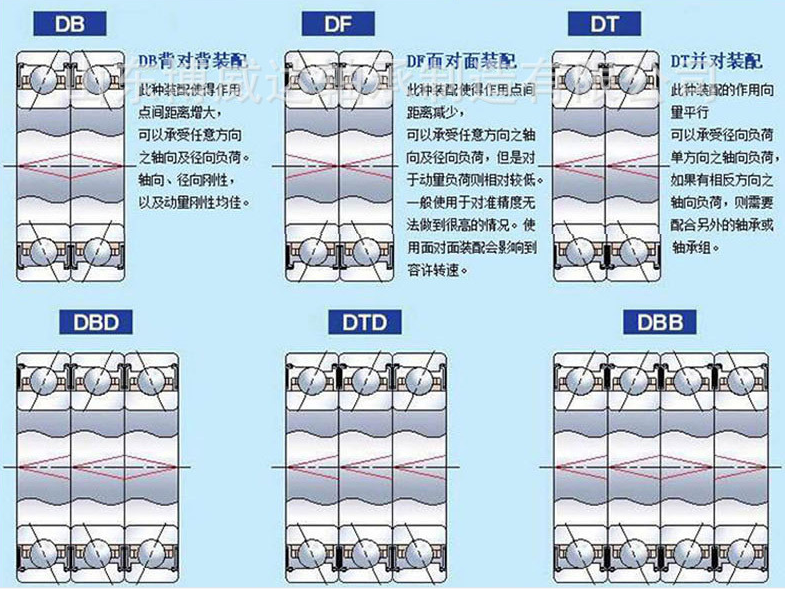 雙列角接觸球軸承能承受較大的徑向負(fù)荷為主的徑向和軸向聯(lián)合負(fù)荷和力矩負(fù)荷,限制軸的兩方面的軸向位移。主要用于限制軸和外殼雙向軸向位移的部件中雙列角接觸球軸承內(nèi)、外圈之間的可傾斜性有限,允許傾斜角取決于軸承的內(nèi)部間隙、軸承尺寸、內(nèi)部設(shè)計及作用于軸承上的力和力矩,而最大允許傾斜角應(yīng)保證軸承內(nèi)不會產(chǎn)生過高的附加應(yīng)力。若軸承內(nèi)、外圈之間存在傾斜角,將影響軸承的壽命,同時造成軸承運(yùn)轉(zhuǎn)精度下降,運(yùn)轉(zhuǎn)噪聲增大。雙列角接觸球軸承一般采用尼龍保持架或黃銅實體保持架。雙列角接觸球軸承安裝時應(yīng)注意,雖然軸承可承受雙向軸向載荷,但若一側(cè)有裝球缺口時,則應(yīng)注意不要讓主要軸向載荷通過有缺口的一側(cè)溝邊。在軸承使用時應(yīng)注意使不帶裝球缺口的一側(cè)滾道承受主要載荷。