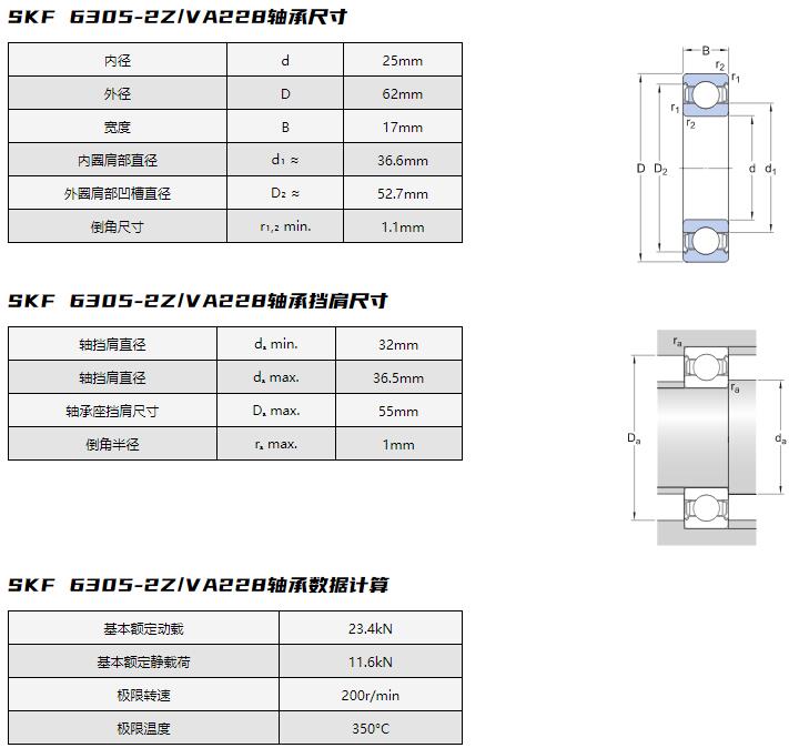 SKF 6305-2Z/VA228軸承屬于用于高溫應(yīng)用場(chǎng)合的單列深溝球軸承,需要進(jìn)行跑合:No。